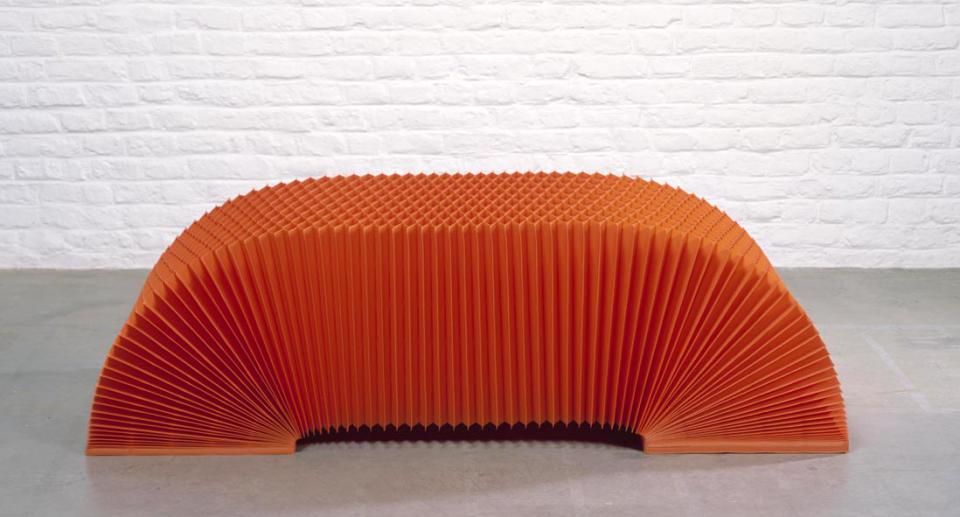 Banc extensible en polypropylène, orange. Feuilles assemblées en nid d'abeille.