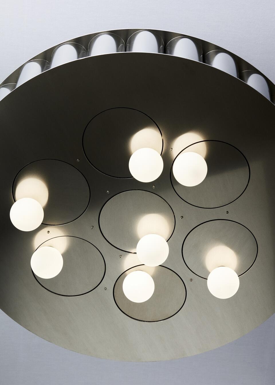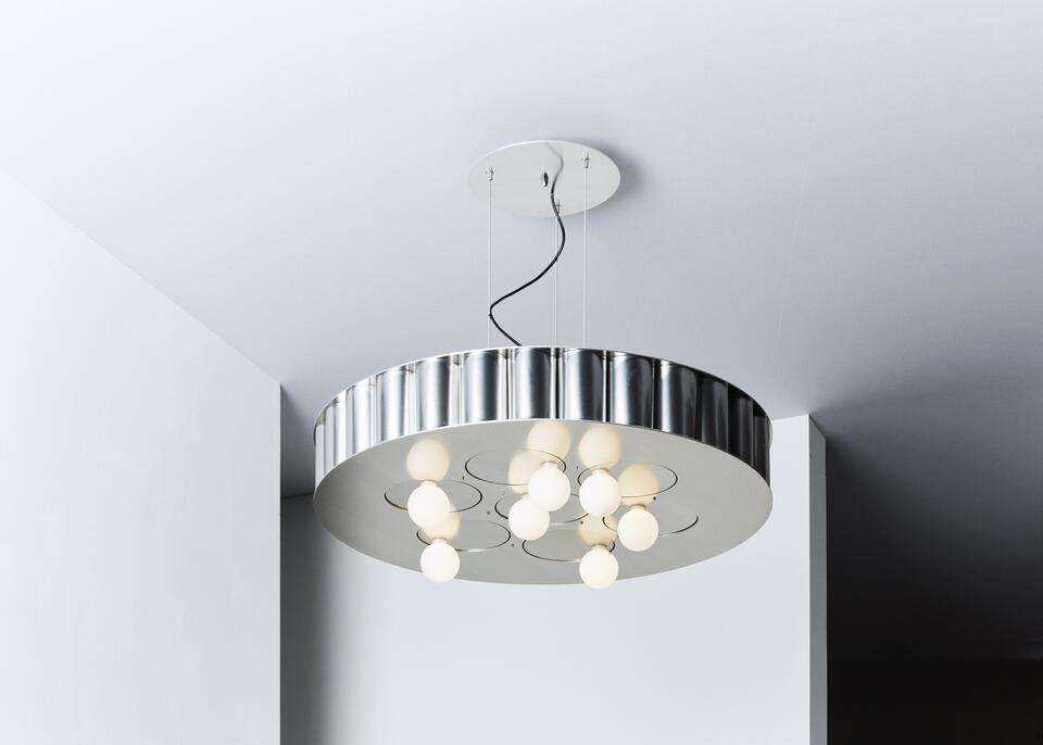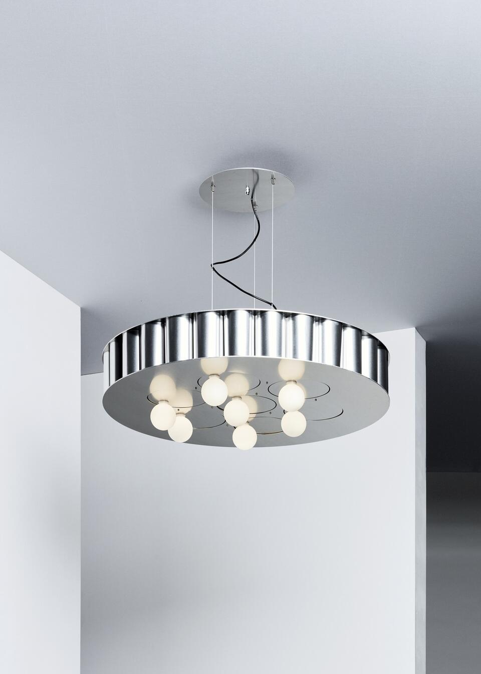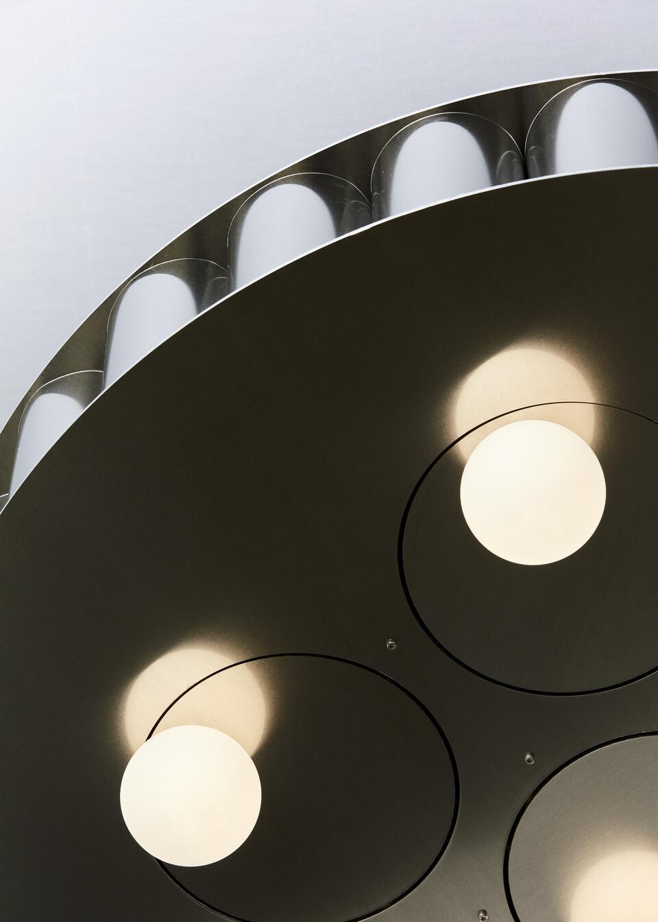 Le mouvement guide le regard qui glisse d'un point à un autre, emporté dans une expérience contemplative de mouvement continu, rappelant les joies d'un manège léger. Le traitement monochrome en aluminium brillant contraste avec l'aspect doux et diffus des lumières. La surface réfléchissante multiplie les points lumineux, rappelant l'expérience agréable de la perte de repères lors d'un moment de plaisir.