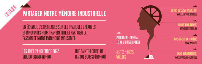 Pour fêter les 10 ans de leur reconnaissance au patrimoine mondial par l’UNESCO, Bois-du-Luc, Bois du Cazier, Blegny-Mine, Grand-Hornu et l’AWAP vous proposent un colloque qui explorera diverses thématiques : numérisation, visites virtuelles, expériences participatives, nouveaux publics…