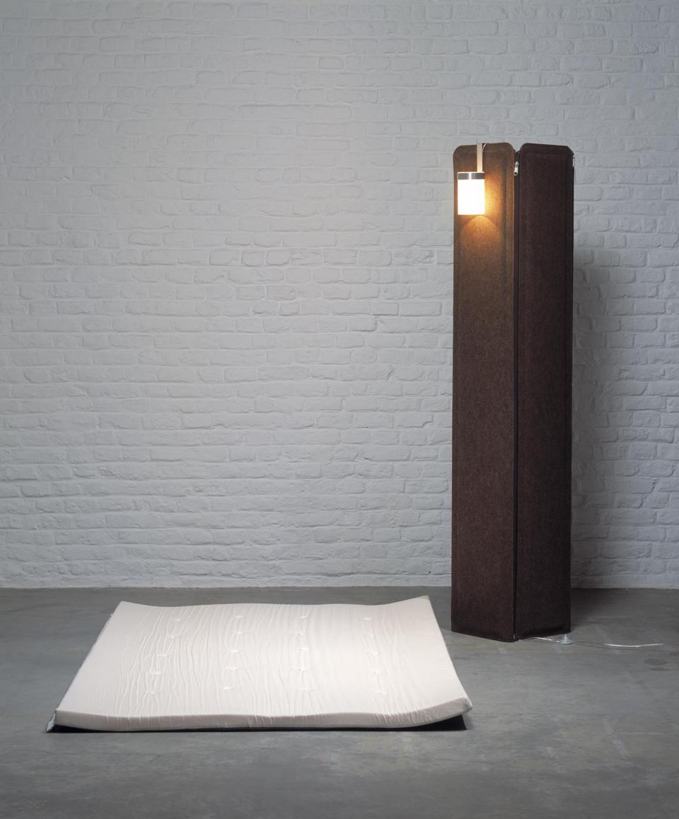 "A hauteur d’homme, cette colonne de feutre gris contient quelque chose : par l’action d’une fermeture à glissière verticale, on parvient à dégager dans un premier temps les quatre côtés de ce qui peut devenir un paravent ou un tapis et à s’emparer dans un second temps du matelas roulé. Une fois ce dernier libéré des scratchs qui le retenaient en rouleau, on peut le poser à terre. Ça y est, le lit est fait. Et il est fait pour l’invité. Ce n’est pas compliqué." Emmanuelle Lallement
