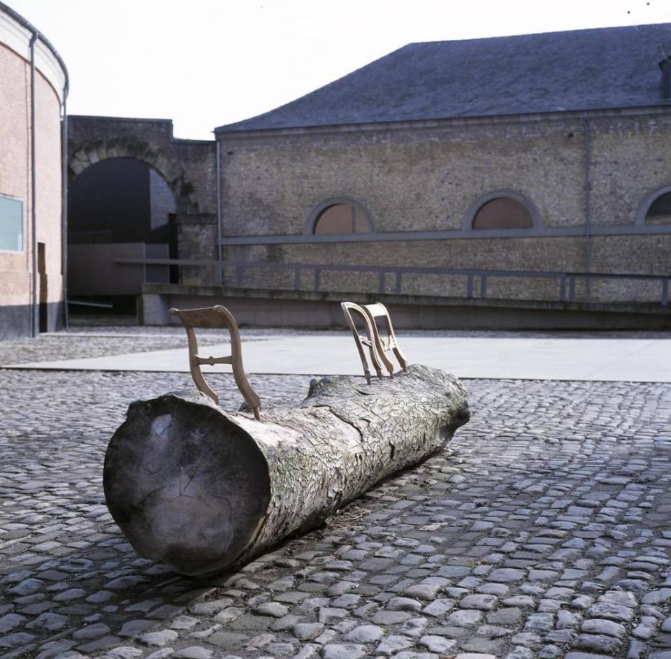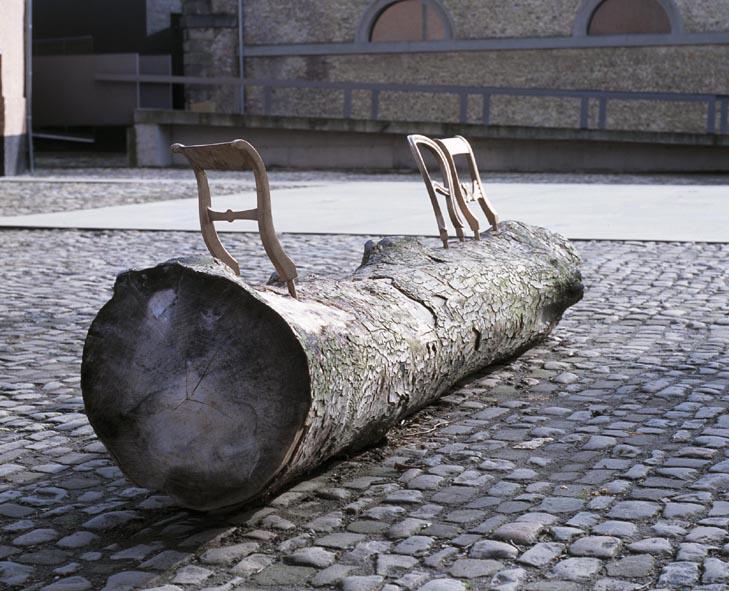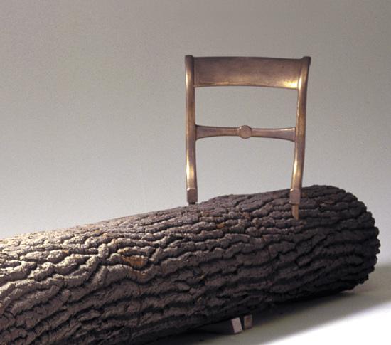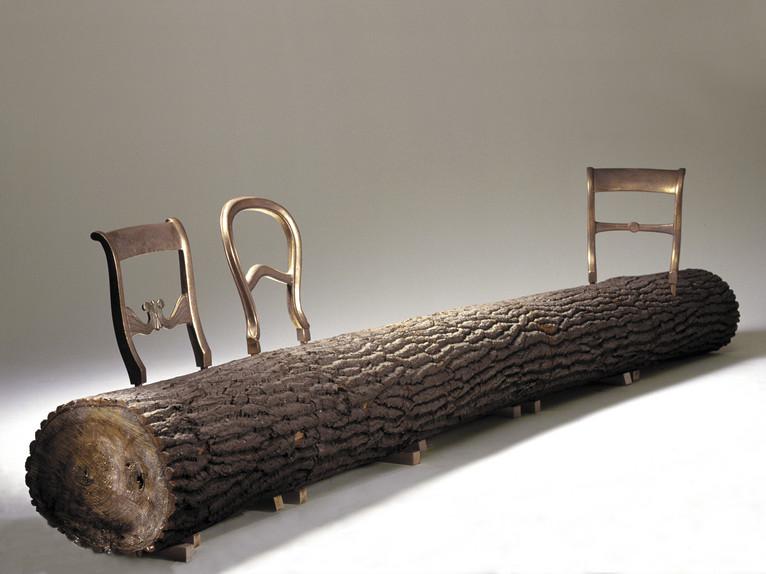 Trois pièces en bronze en forme de dossiers de chaises de différents styles, fichées dans un tronc d'arbre quelconque, finissent par former un banc.