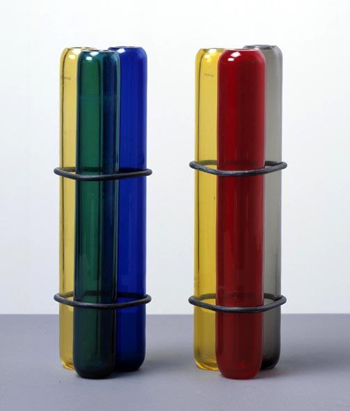 Créé par Pierre Charpin au Cirva et édité par Venini, Triplo est un vase composé de trois tubes en verre soufflé et faits à la main, assemblés par des bandes en caoutchouc.