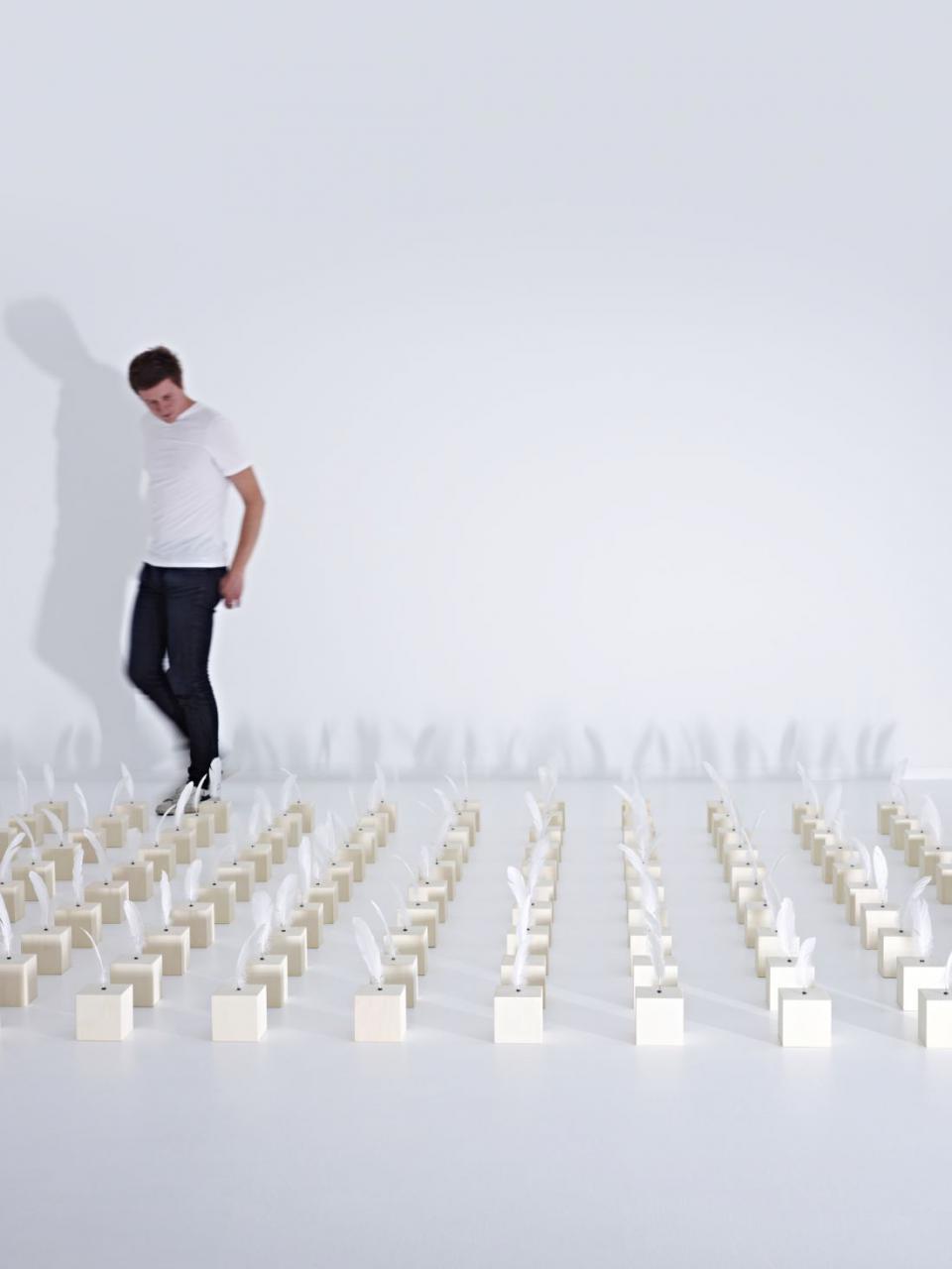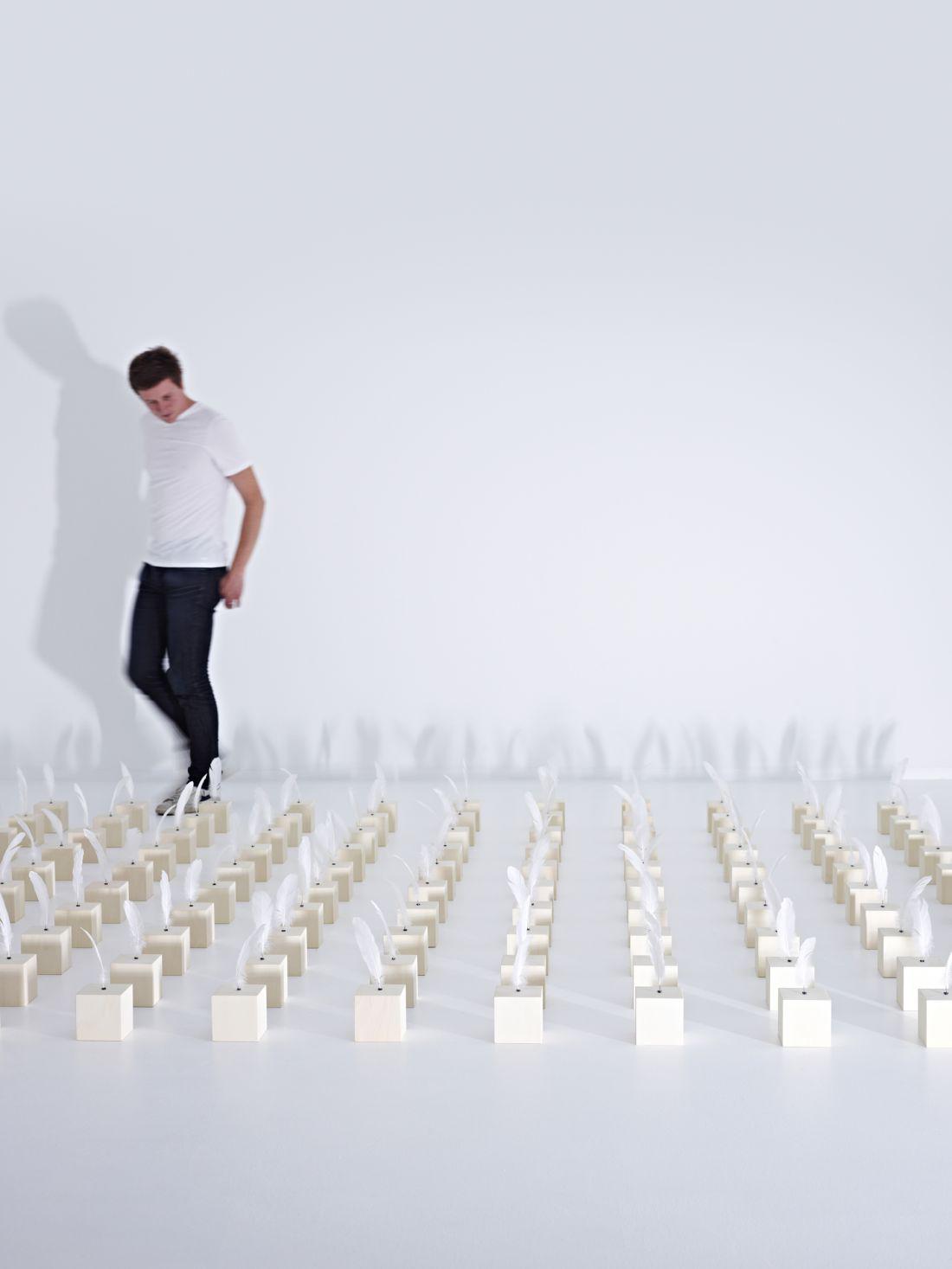 Mue par un mécanisme invisible, la plume marque la fuite du temps d’un mouvement bref, chaque rotation correspond à une seconde. L'installation, créée pour l'exposition Jean-François D'Or. Moodboards au CID en 2013, comprend 74 éléments.