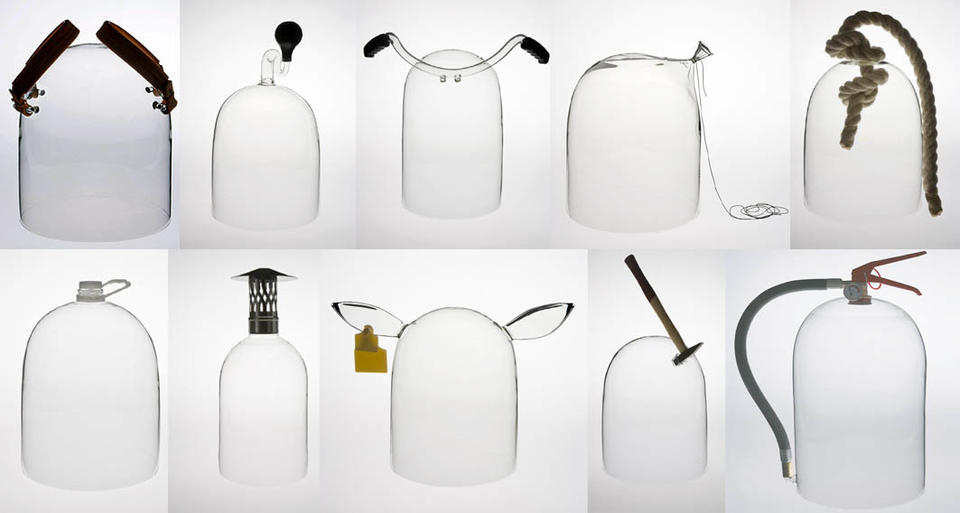 This & That est une collection de dix cloches en verre réalisée par les jeunes designers de Fabrica, d’après une idée originale du designer Tak Cheung. Produites par Secondome, ces pièces associent des objets de la vie quotidienne (un guidon de vélo, un ballon, un extincteur, un marteau, une bouteille en plastique,…) à la beauté raffinée du verre soufflé.