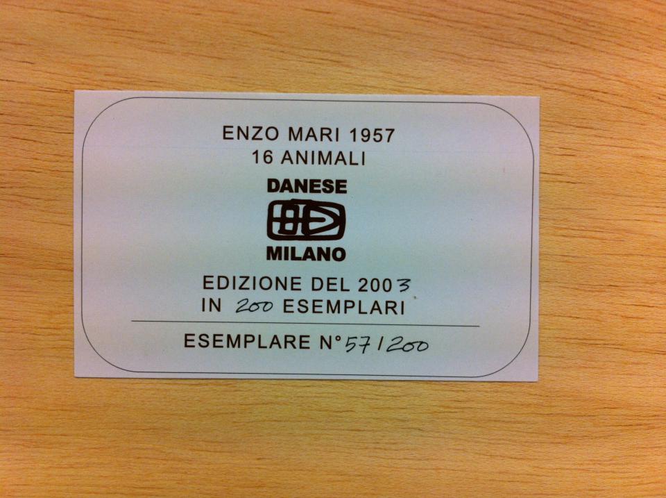 Edité à seulement 300 exemplaires par an, 16 animali est un jeu créé par Enzo Mari pour Danese. Seize pièces en bois de chêne rouvre représentant des animaux divers sont imbriquées dans une boîte en bois de chêne.
