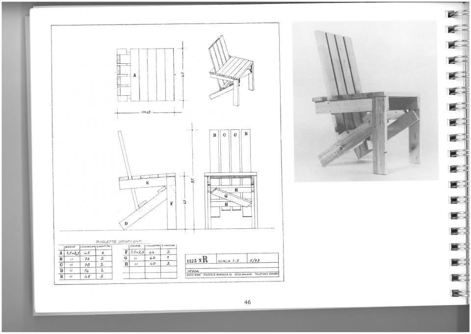 A l'occasion de l'exposition En 1974, Enzo Mari exposait à la Galleria Milano, sous le titre Proposta per autoprogettazione, une série de meubles réalisés de façon très simple à partir d’un assemblage de planches standards à l’aide de matériel de bricolage ordinaire. Mais le côté révolutionnaire de la manifestation résidait dans le fait que le designer incitait les visiteurs à s’approprier les plans et à reproduire eux-mêmes les pièces de mobilier. Du DIY avant la lettre. Ces plans, distribués gratuitement pendant l’exposition, furent ensuite réunis sous forme de livre, publié par la maison Corraini.
