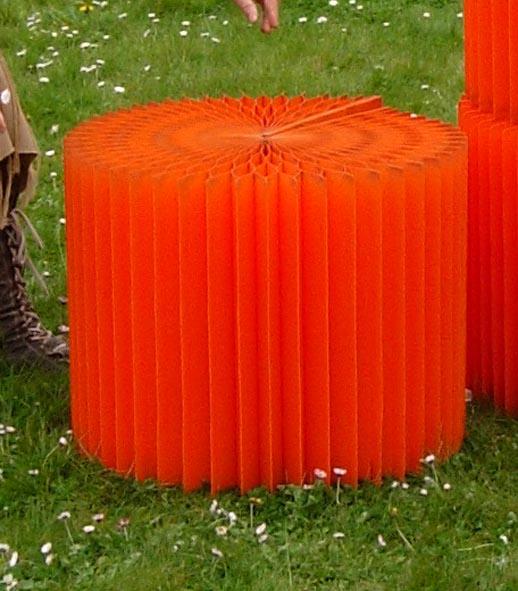 Table ou pouf, formé d'une section du banc extensible en polypropylène, orange. Feuilles assemblées en nid d'abeille.
