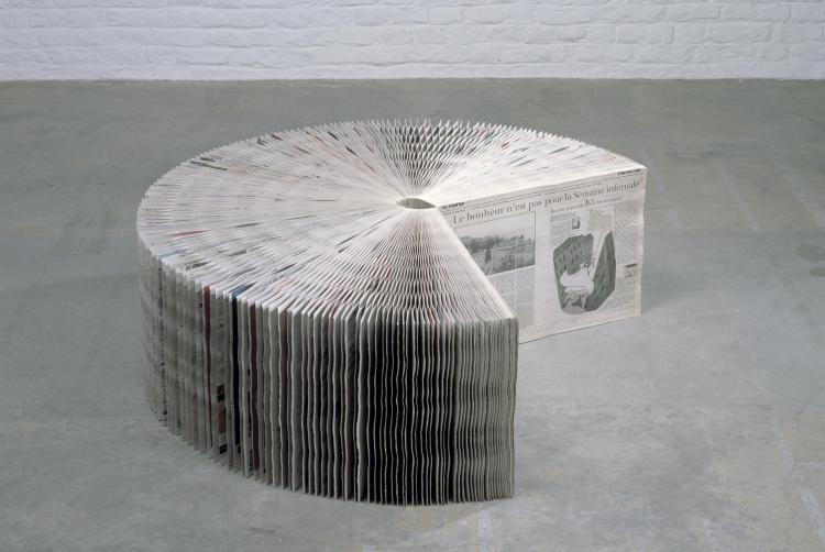 Banc extensible alvéolaire de près de 700 feuilles de papier journal. Six feuilles sont pressées et collées à la colle à tapisser pour obtenir l'épaisseur de base. Charles Kaisin s'est inspiré de son expérience japonaise pour créer un objet à la fois résistant, souple et extensible qui peut ainsi prendre plusieurs formes : circulaire ou rectiligne.
