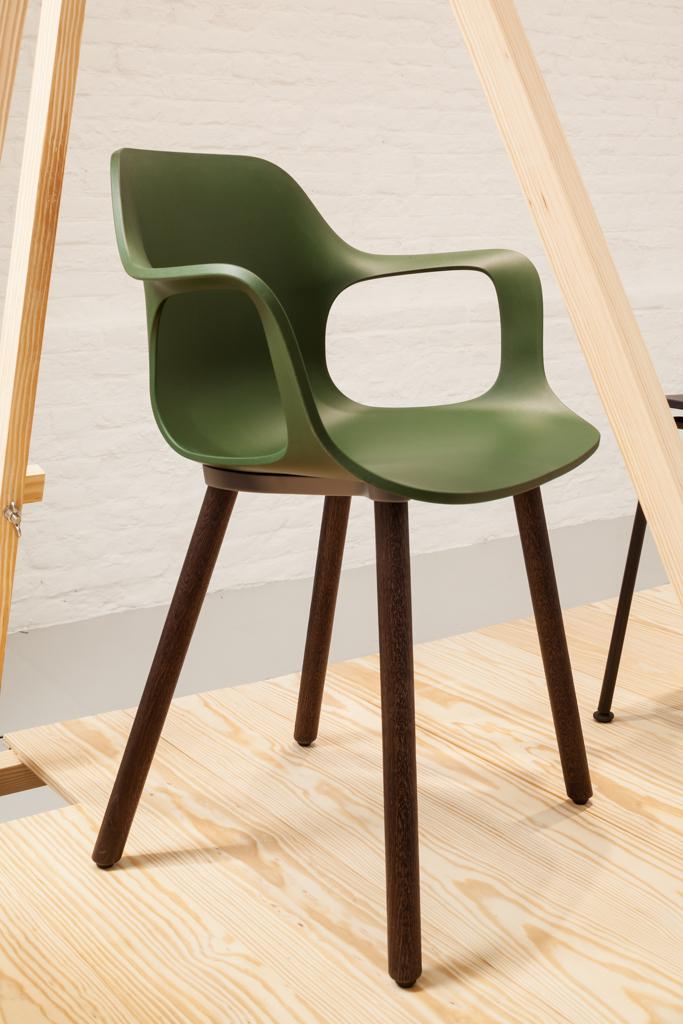 Hal est une chaise avec accoudoirs et piétement en chêne massif foncé avec vernis de protection. La coque d'assise en polypropylène est de couleur lierre. Le piétement est posé sur des patins en feutre pour sol dur.