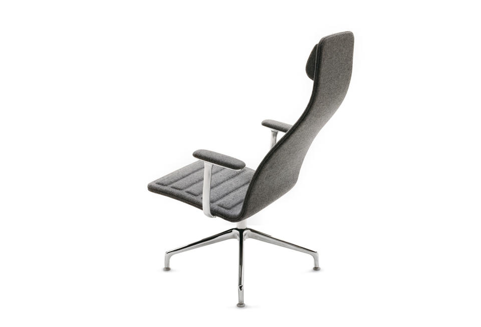 Le fauteuil pivotant Lotus Attesa de Jasper Morrison pour Cappellini est en hêtre et en contreplaqué. Il dispose d'un repose-tête, d'accoudoirs et d'un piètement en étoile en aluminium chromé moulé sous pression muni de pieds en plastique. Le rembourrage est en mousse de polyuréthane de multi-densité.