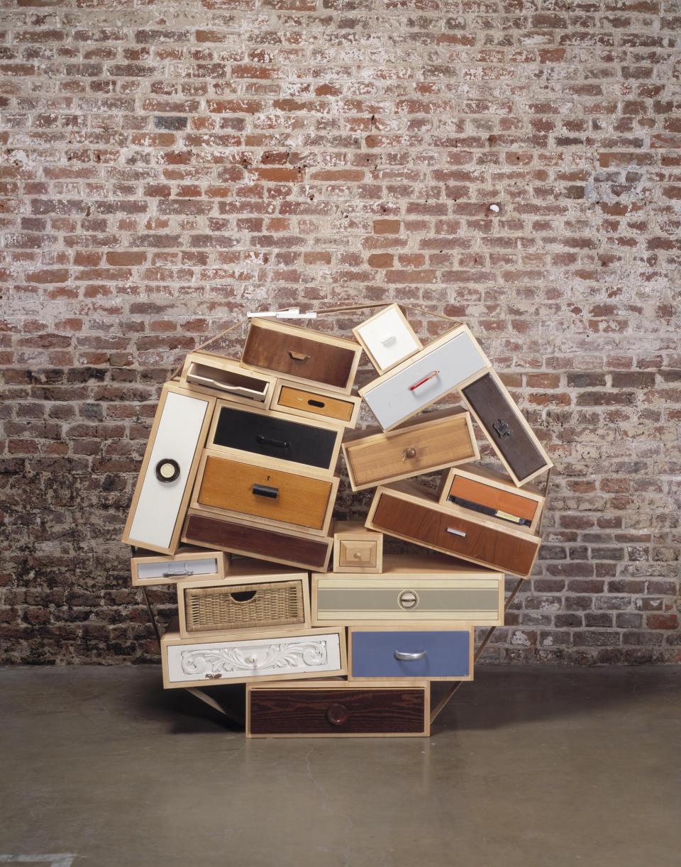 Pour la première exposition du collectif néerlandais Droog Design, Tejo Remy a créé un meuble de rangement à partir d’une collection de tiroirs de récupération dépareillés qu’il a assemblé au hasard. Chaque tiroir est enchâssé dans une boîte en érable faite sur mesure et toutes les boites sont maintenues par une sangle en jute. L e designer allemand s’est inspiré du roman Robinson Crusoe pour créer ce meuble fait à partir de vieux tiroirs dont plus personne n’en voudrait. «Je me suis toujours demandé ce qu’on pouvait fabriquer d’autre que ce qui existait déjà, confie-t-il. Je crois plus que jamais en l’idée qu’il est possible de créer son propre paradis chez soi avec ce qui nous est directement accessible.» Ce meuble chaotique synthétise une attitude critique face au consumérisme et à la (sur)production industrielle.