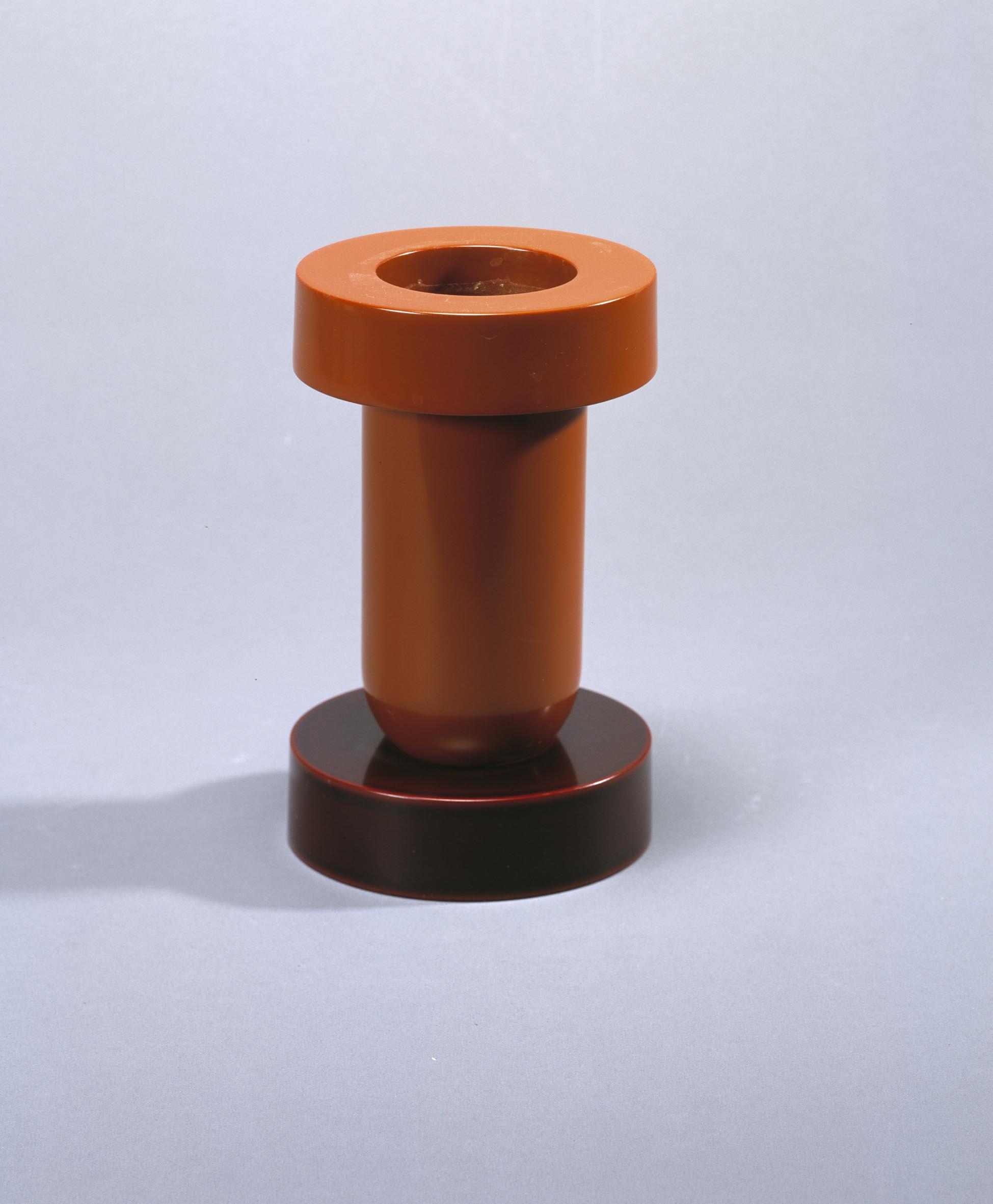 Le vase Mirto en résine phénolique et poudre de bois recouvert de laque urushi fait partie de la collection d'objets conçue par Ettore Sottsass pour Marutomi, Japon. L’architecte et designer italien Ettore Sottsass (1917-2007) s’est confronté durant les années nonante à la tradition séculaire de l’artisanat japonais, l’Urushi Kogei. Dans un long processus d'échange intellectuel et de découverte de la forme, il a conçu- en étroite coopération avec l’élite des maîtres japonais spécialisés dans cette technique hautement sophistiquée – des conteneurs et les objets incarnant la modernité de l’Occident et l’esprit de l’Extrême-Orient, l'esprit italien et le raffinement japonais.