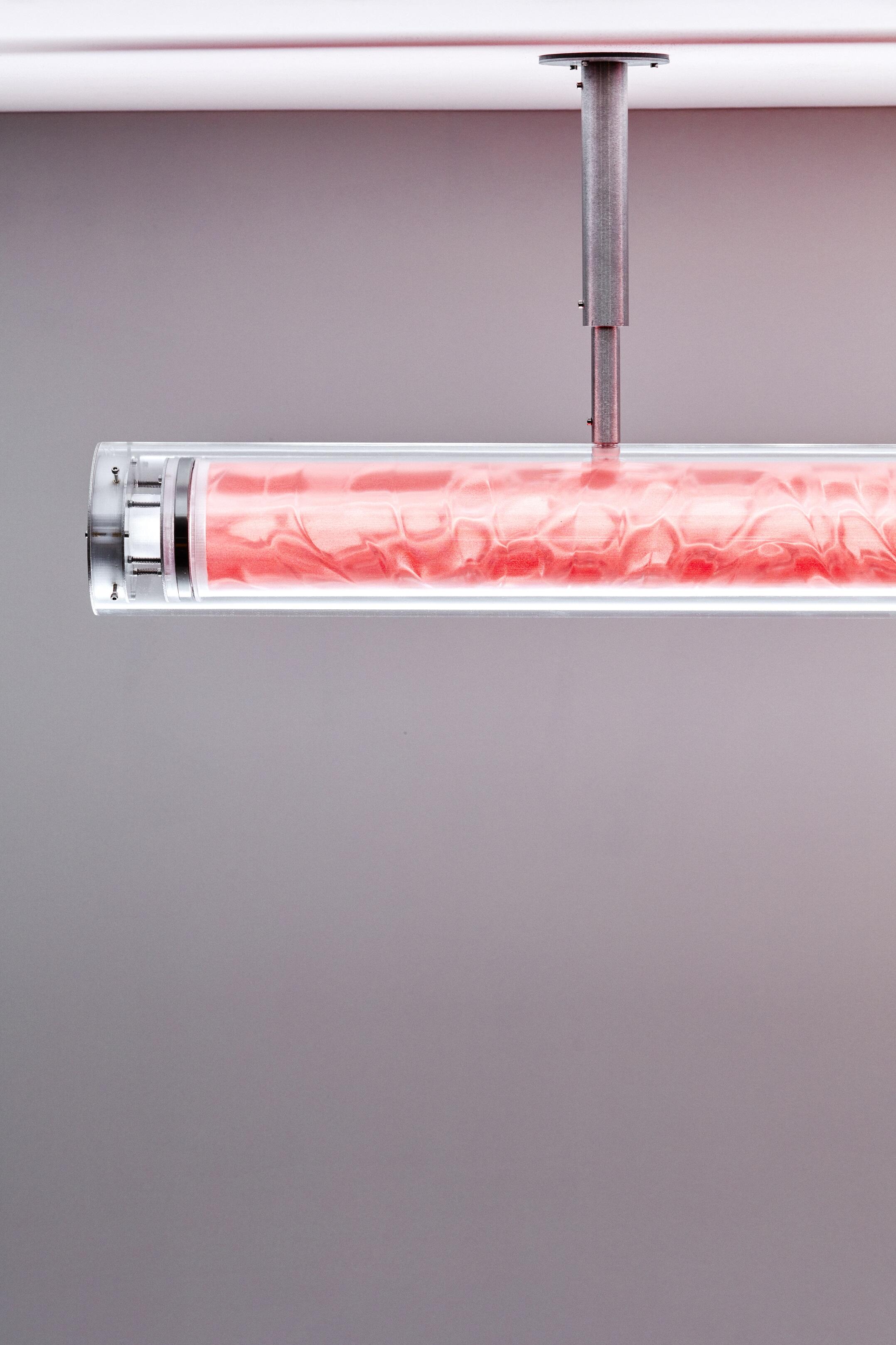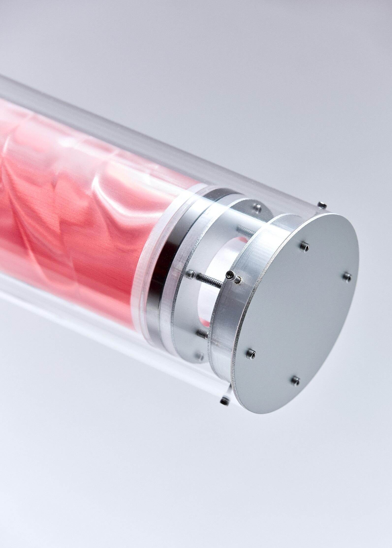 Matériaux : tubes acryliques, tube LED, filtres optiques, aluminium, pièces techniques imprimées, roulements à billes, moteur, convertisseur (lumière graduable) dans un boîtier technique déporté.