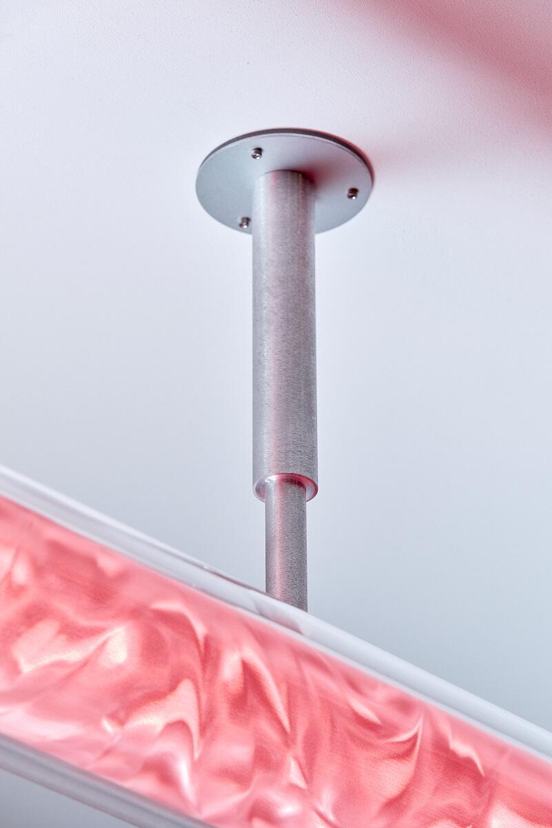 Deux crochets tubulaires en aluminium rappellent en détail le système de piston qui maintient les auvents des stands de foire.