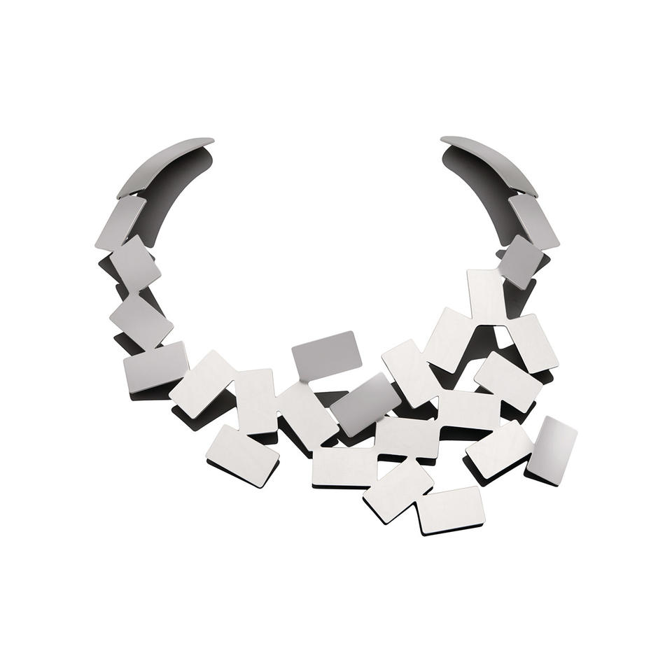 Le thème de La Stanza dello Scirocco, creé par Mario Trimarchi, la belle série formée de cartes métalliques rectangulaires, se conjugue dans le collier Fiato sul collo en inaugurant un type d’ornement personnel et en creant une typologie de bijoux.