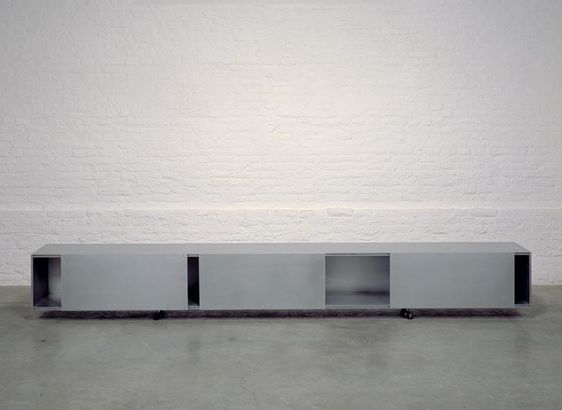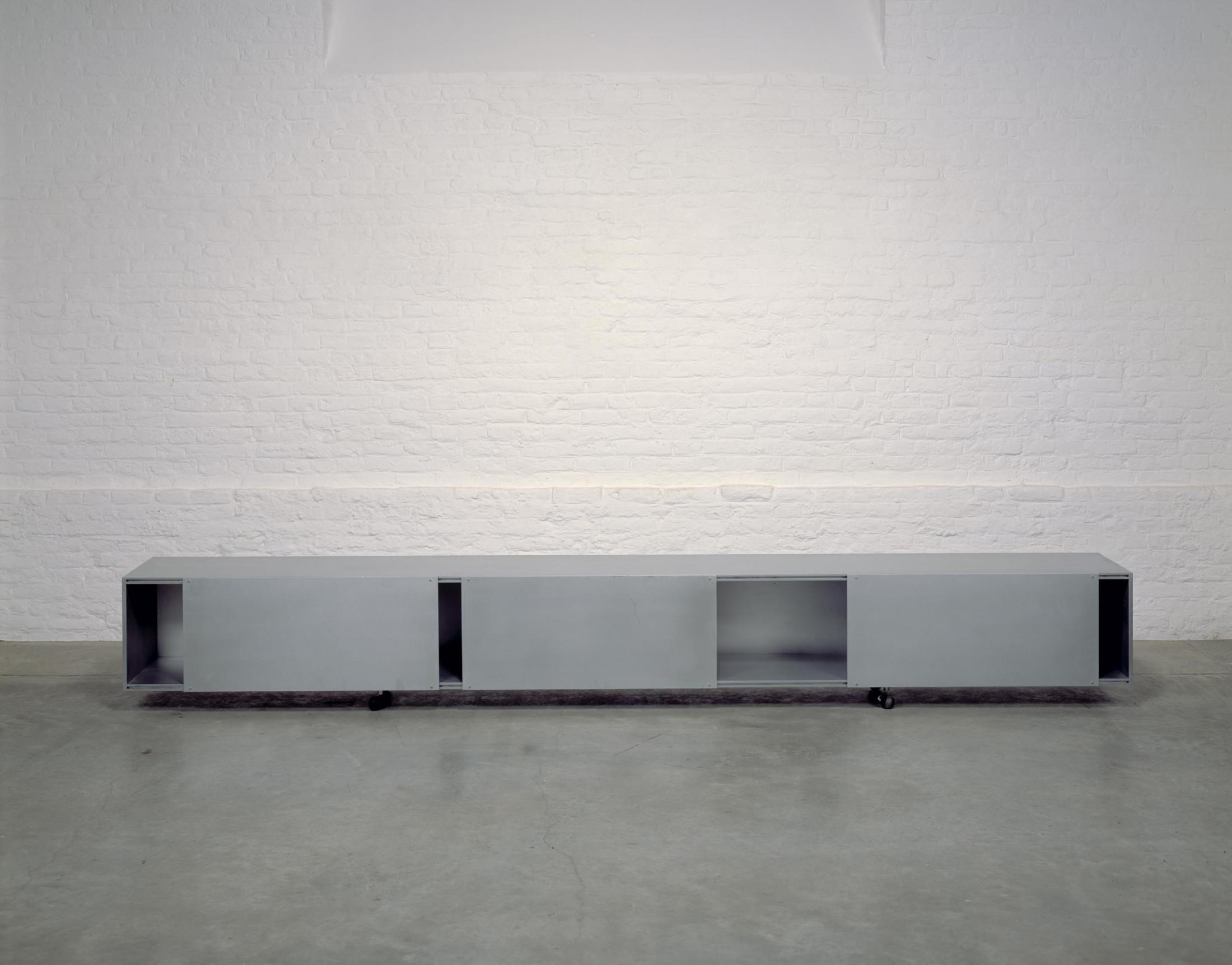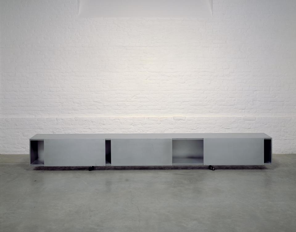 Armoire basse sur roulettes, avec 3 portes coulissantes, aluminium, profilé extrudé + tôlerie. Poli et ciré.