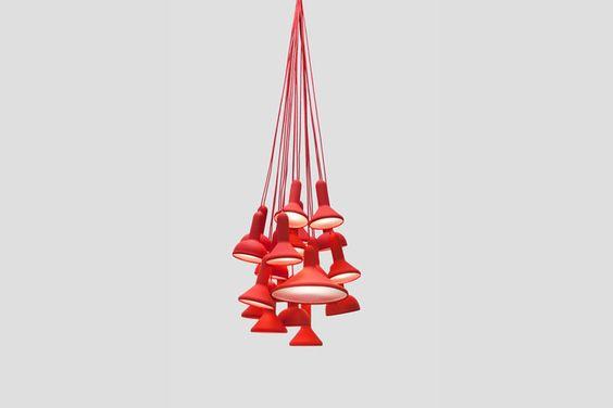 Luminaire composé de plusieurs lampes en polymère plastifié PVC noir disposées en grappe.