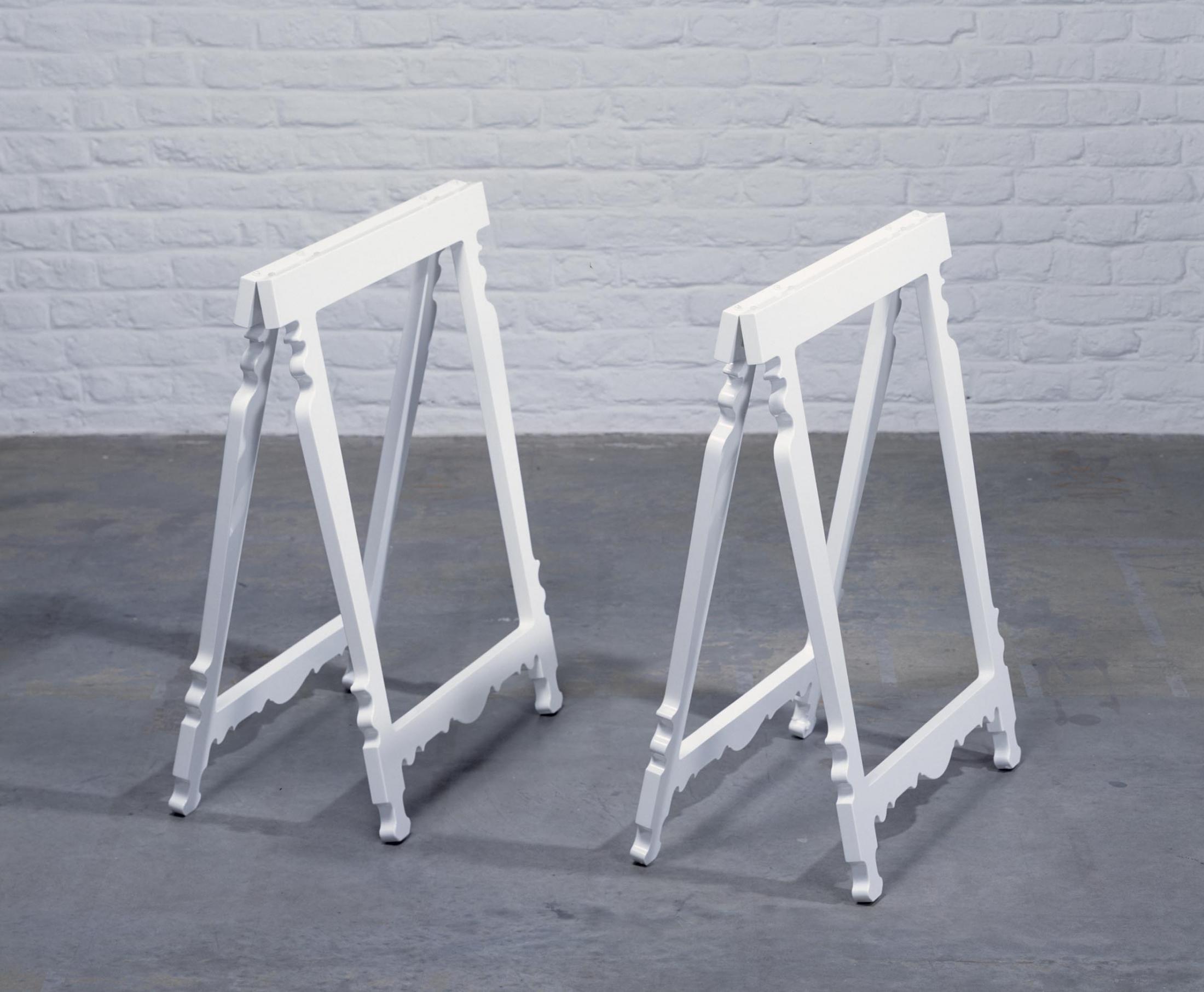 Le tréteau est un objet discret, ordinaire et fonctionnel. Nous voulions lui donner les courbes évoquant la silhouette d'un pied de table classique en bois tourné. Le style Louis XIII est caractérisé par ses ornements en bois tourné.