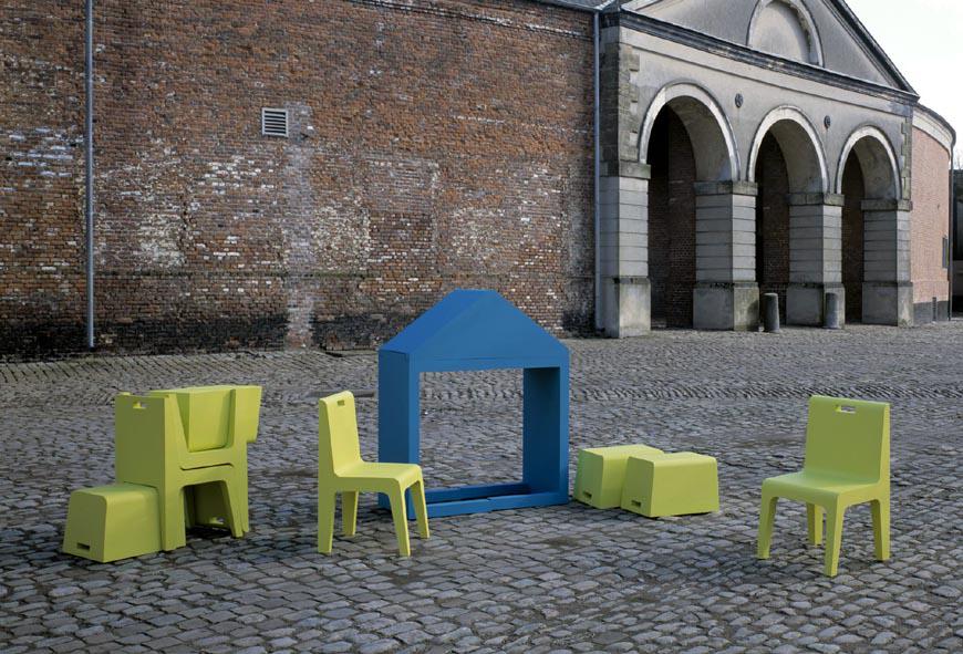 Créé par Matali Crasset le cabanon-mobilier de jardin se présente de prime abord en un bloc, mais il peut se désolidariser pour donner naissance à du mobilier d'extérieur. Il représente la volonté d'habiter la nature tout en restant chez soi; il constitue un espace qui s'"expanse" pour permettre l'hospitalité. La famille, à l'image de l'enfant, s'approprie le lieu de façon ludique.