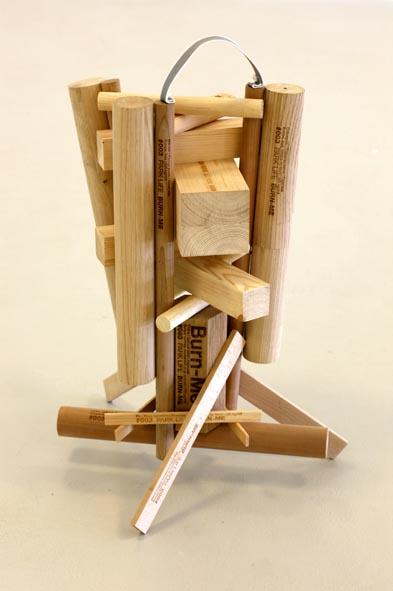 Tas de bois prêt-à-brûler, constitué de petits blocs de bois, spécialement designés pour être brûlés, soit plusieurs formes en différents types de bois (chêne, châtaignier, merisier, cèdre, hêtre, pin) de dimensions variées. L'assemblage est précis, l'objet est transportable. Partie intégrante de la série Park Life dans une édition limitée à 250 exemplaires signés et numérotés, les Burn-Me Pieces sont assemblées et conçues de telle manière qu'elles prennent la forme d'un feu de camp ouvert. Mais ces pièces de collection ne prennent vie que si on les détruit. Voilà l'objet-Guixé idéal : on ne le possède vraiment que quand on ne l'a plus.