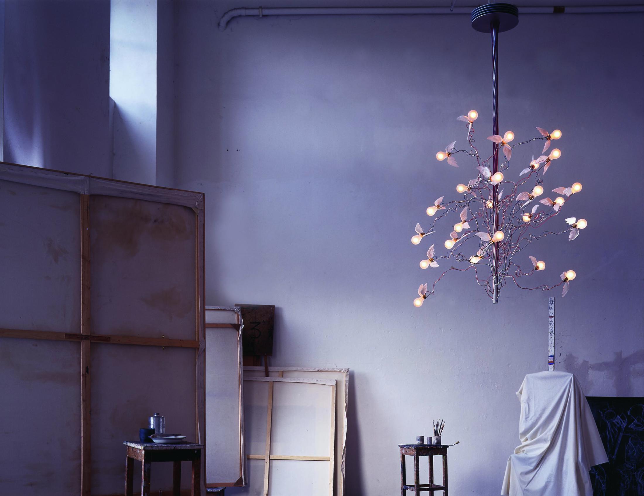 Birds Birds Birds est le premier 'Lustre’ que Ingo Maurer a conçu avec les ampoules ailées. La lampe de table Lucellino a été présentée au même moment.