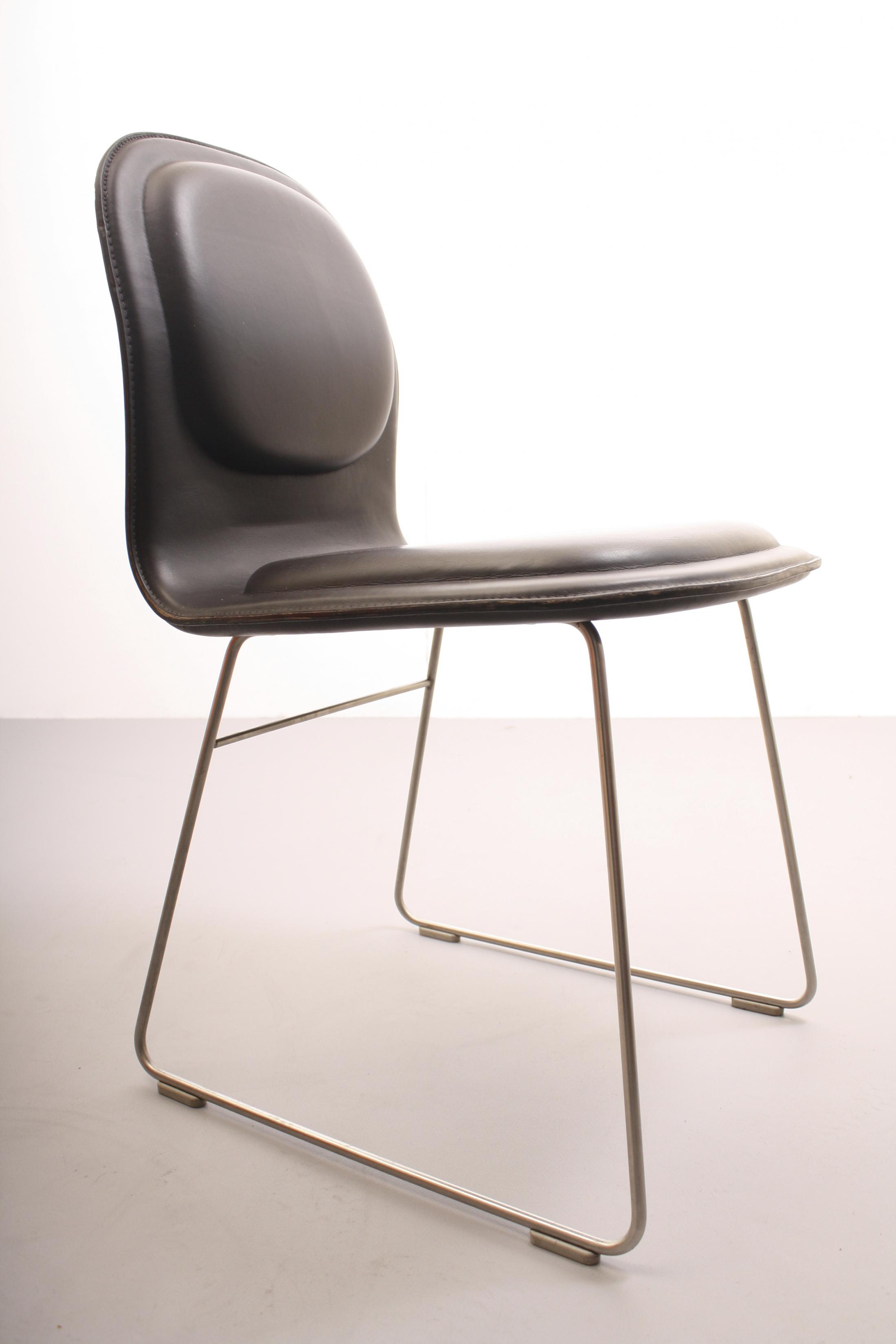 La chaise Hi Pad de Jasper Morrison a une assise en hêtre et en bouleau contreplaqué rembourré avec de la mousse de polyuréthane de multi-densité . Le revêtement fixe est en tissu ou cuir. La base est en acier inox satiné et polypropylène.